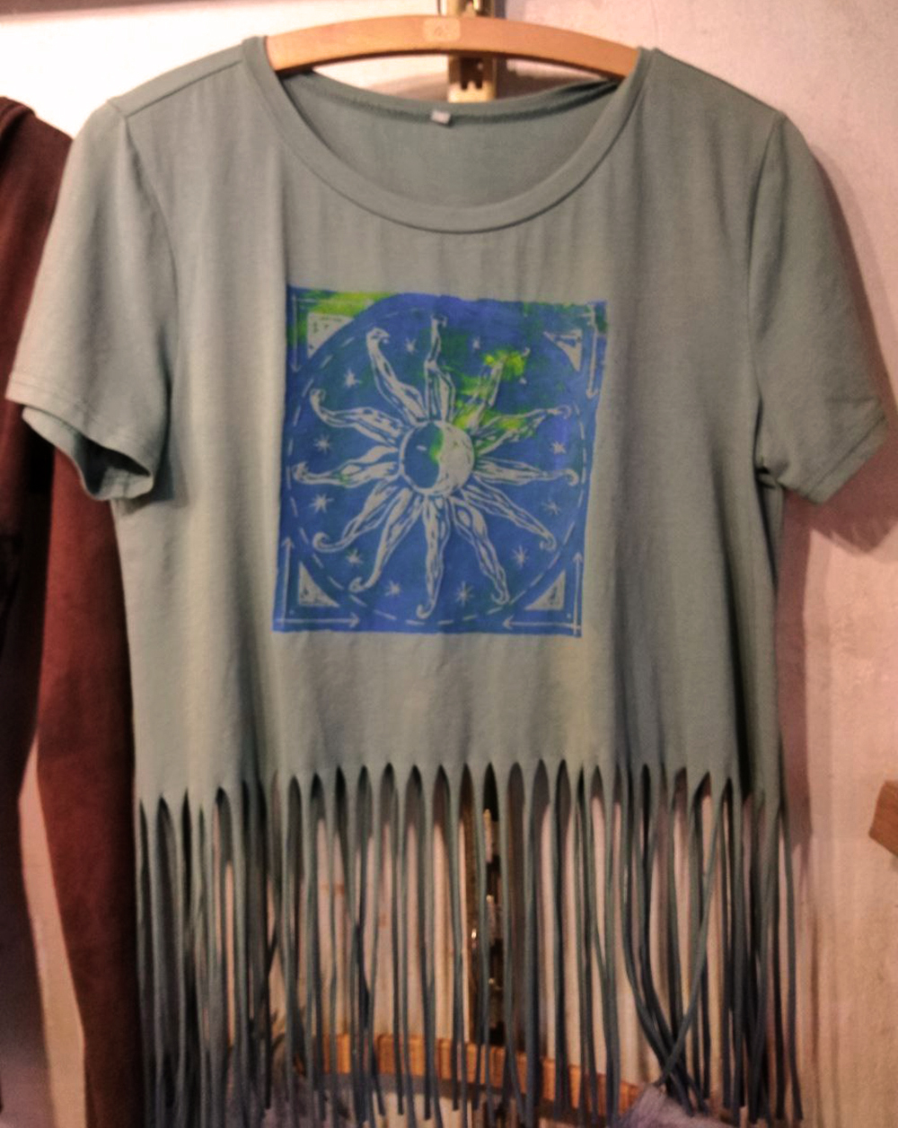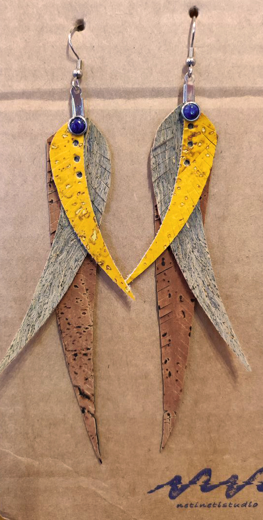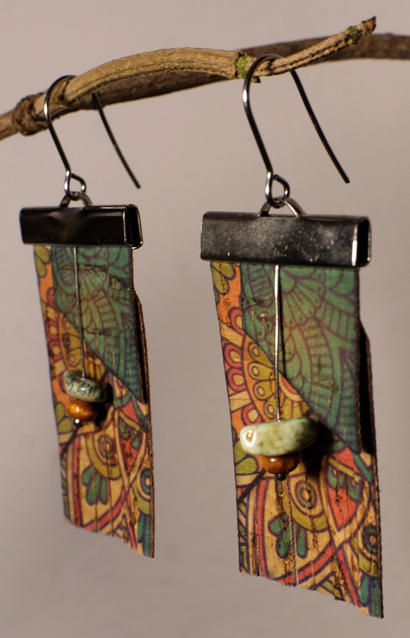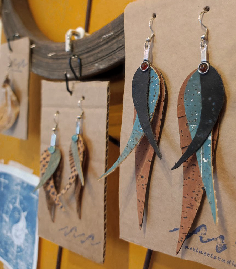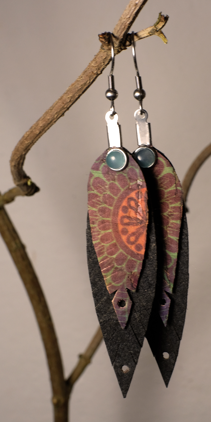 Ich lasse mich überwiegend von Flora und Fauna inspirieren. Fundstücke aus der Natur werden so zu echten Unikaten in Sachen Schmuck und geben einen schamanischen Touch. Ob Ohrringe aus Jacaranda-Samen, gesammelt in Portugal, zu Blättern geschnittenes Korkleder aus Portugal oder (ganz neu im Fundus) Seeglas-Unikate und Krebsscheren vom Nordseestrand Juist, eingegossen in Epoxy. Ganz selten gibt es auch mal einen Schmetterlingsflügel in Epoxy getaucht – Fundstücke vom Dachboden. Ich habe Mode-Design studiert und kann mich auch in diesem Bereich nicht zurückhalten – ich batike und “Sieb-drucke” Shirts, die ich gesammelt oder auf dem Flohmarkt gekauft habe, da ich auch hier das Thema Nachhaltigkeit groß schreibe.
