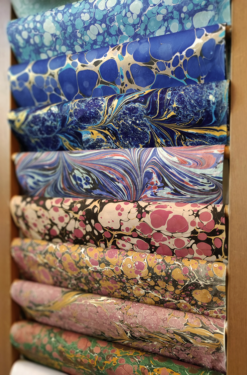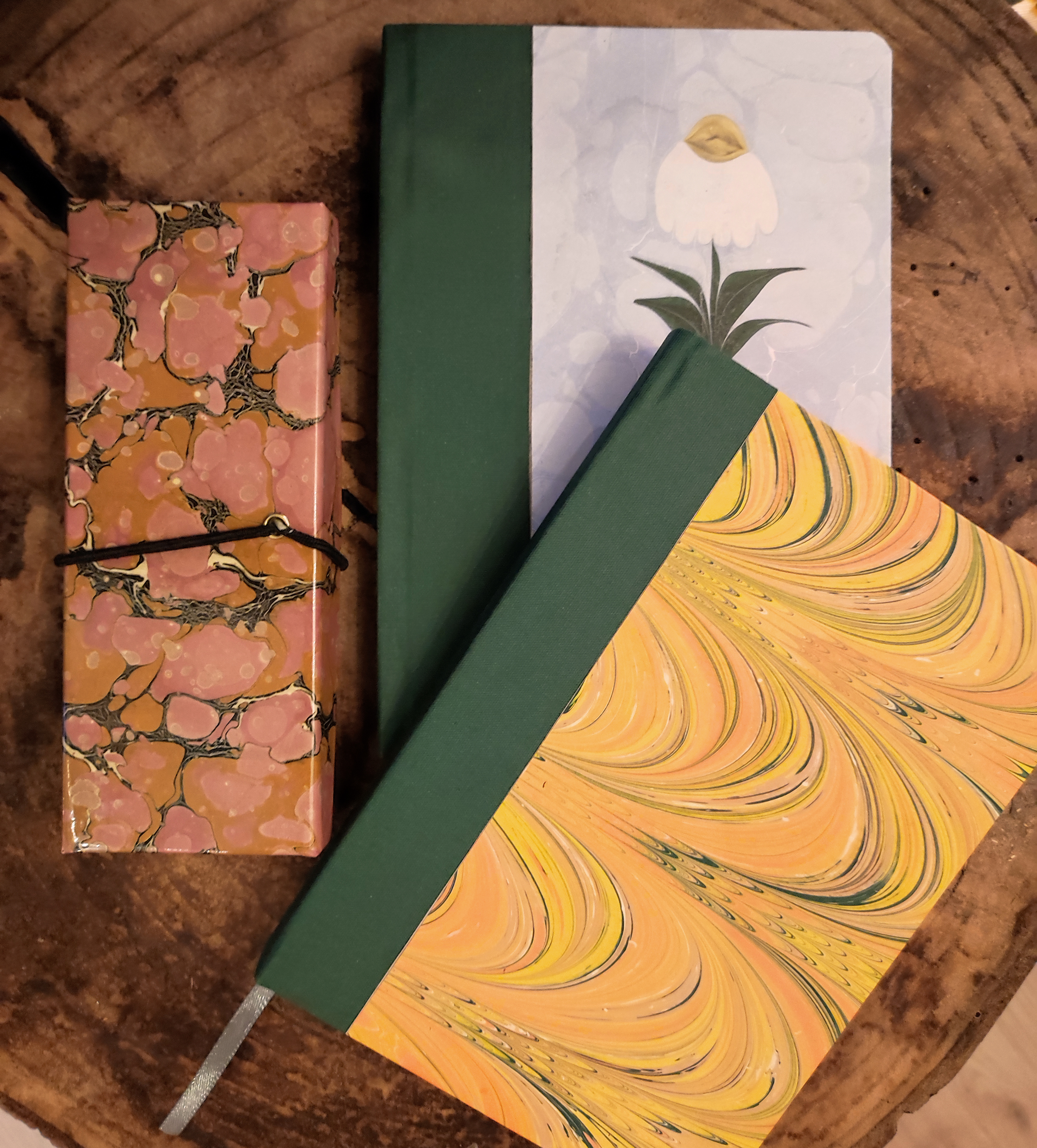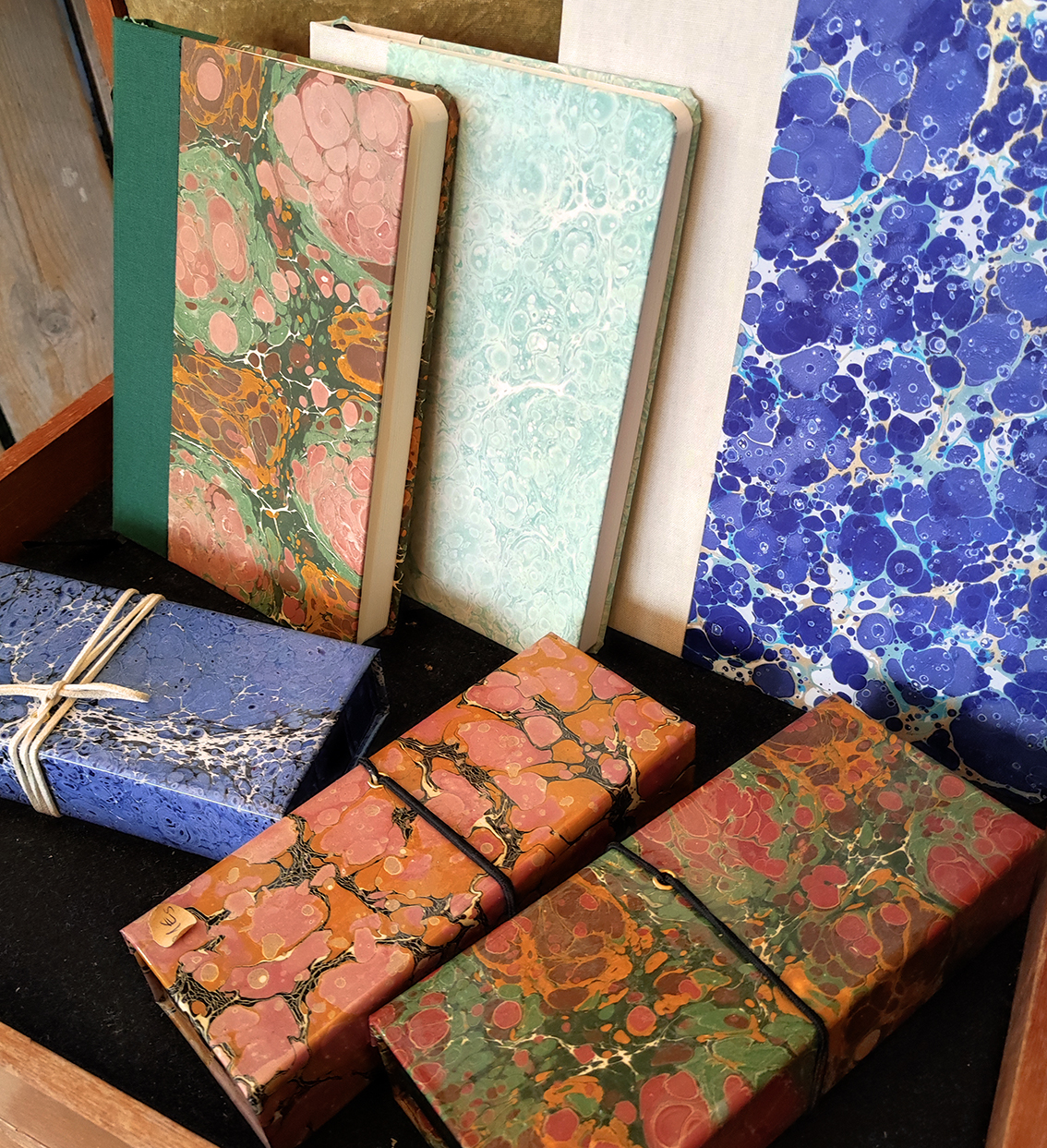 In Sachen Upcycling bin ich noch ein Anfänger, aber ich bemühe mich bei den anderen abzugucken. Momentan könnt ihr in der Wandel-Ecke meine marmorierten Papiere und die damit gebundenen Bücher und alten Schachteln wiederfinden.